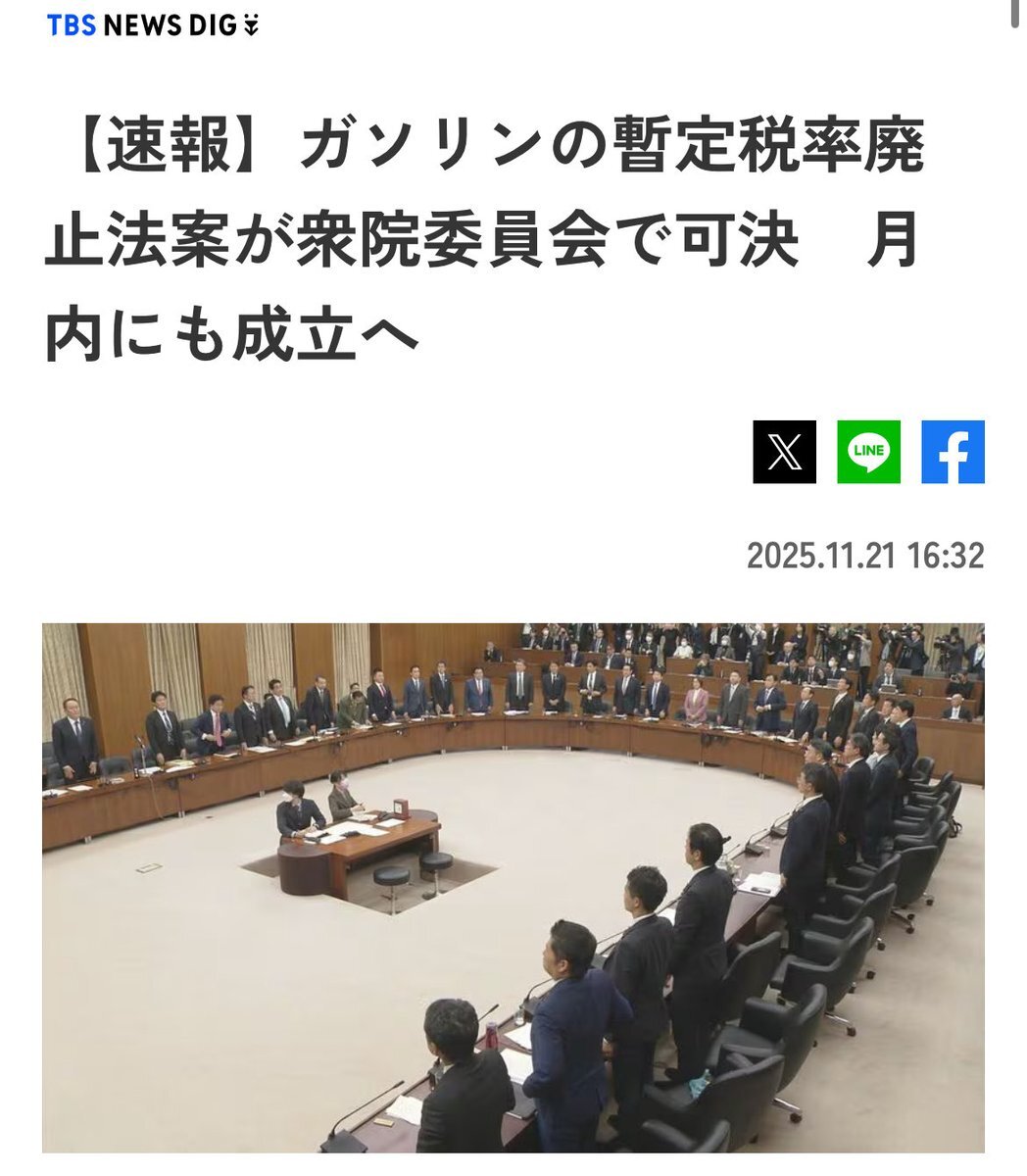 【速報】ガソリン暫定税率廃止法案が衆院委員会で可決…25日に衆院通過し年内に正式廃止の見通し #ldnews news.livedoor.com/article/detail…