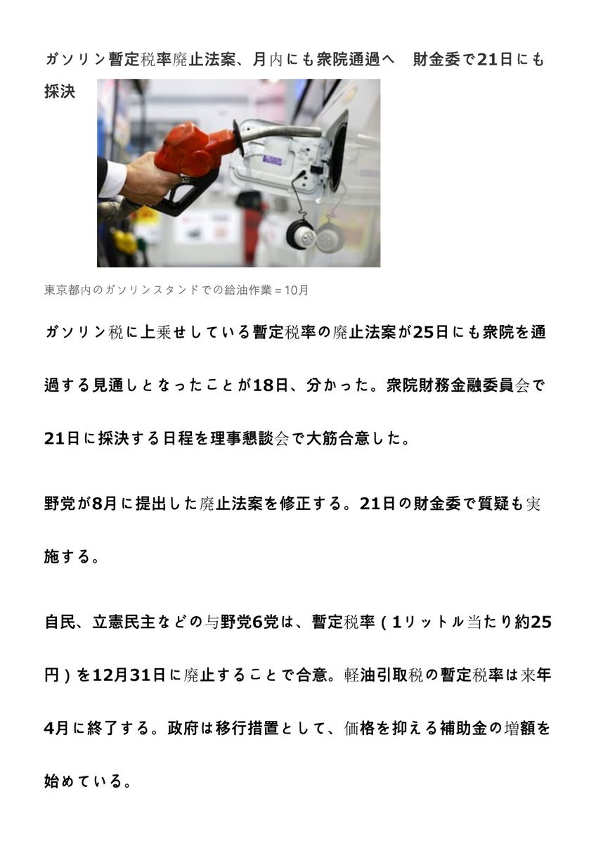 ガソリン暫定税率廃止法案、月内にも衆院通過へ 財金委で21日にも採決 pic.x.com/hDcUkXWiwY