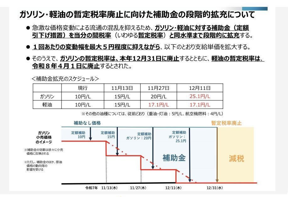 ガソリン暫定税率廃止法案が25日にも衆議院を通過する見通しとなりました。 ◯燃料油価格定額引下げ措置 資源エネルギー庁は、廃止までの当分の間、燃料油価格の定額の価格引き下げ措置を実施しています。なお、補助の効果は徐々に価格に反映されます。 pic.x.com/KO9cE45Cz9