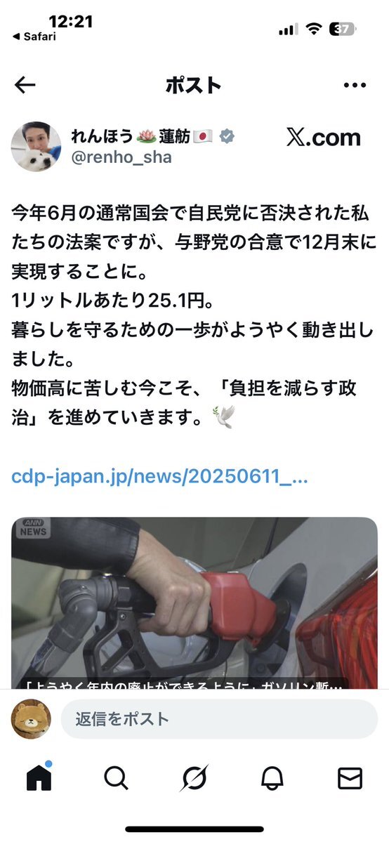 返信先:@nishy03買い控え…やる人いますからね。この日からって決まると大行列…笑 ありえる。 ガソリン暫定税率廃止は、大変ありがたいです。党としては国民民主推しの私ですが、この法案は今の自民党の力なくしてはできなかった。 感謝します。ありがとうございます😊