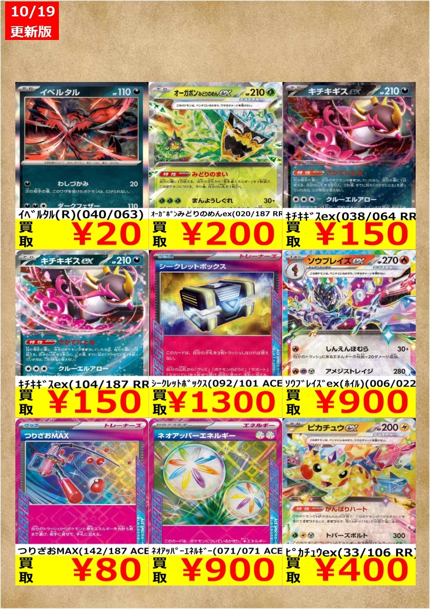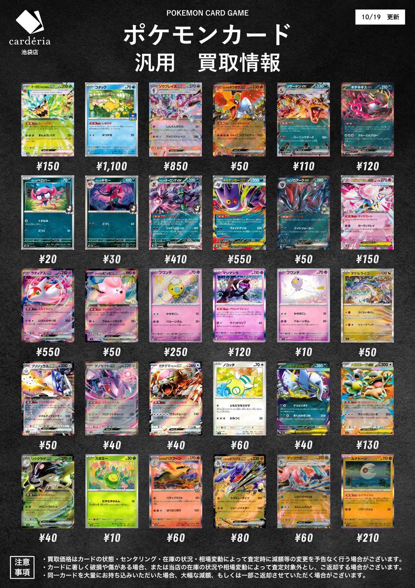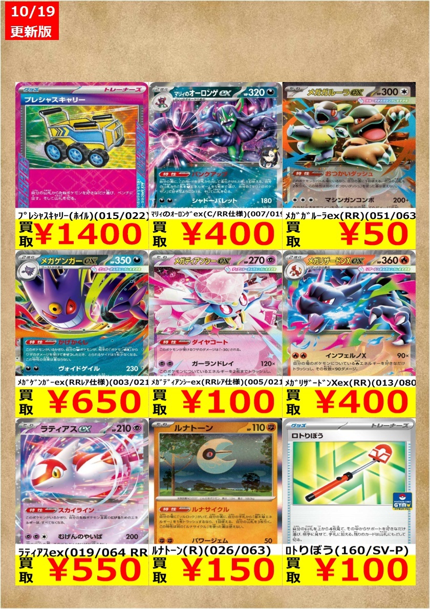 告知時点での買取金額で美品のみ対象です。在庫が表記の上限数量に達しましたら金額は変動致します。(上限20枚) 相場により価格が変動する場合がございます。 メガガルーラex(RR)(051/063) ¥50 ルナトーン(R)(026/063) ¥150 #ポケモンカード #ポケカ pic.x.com/xn5B0hRqwc