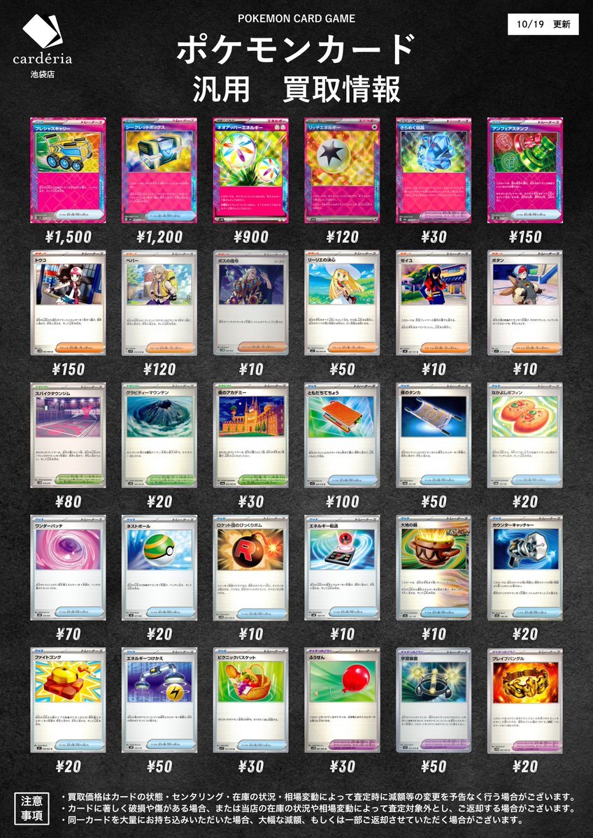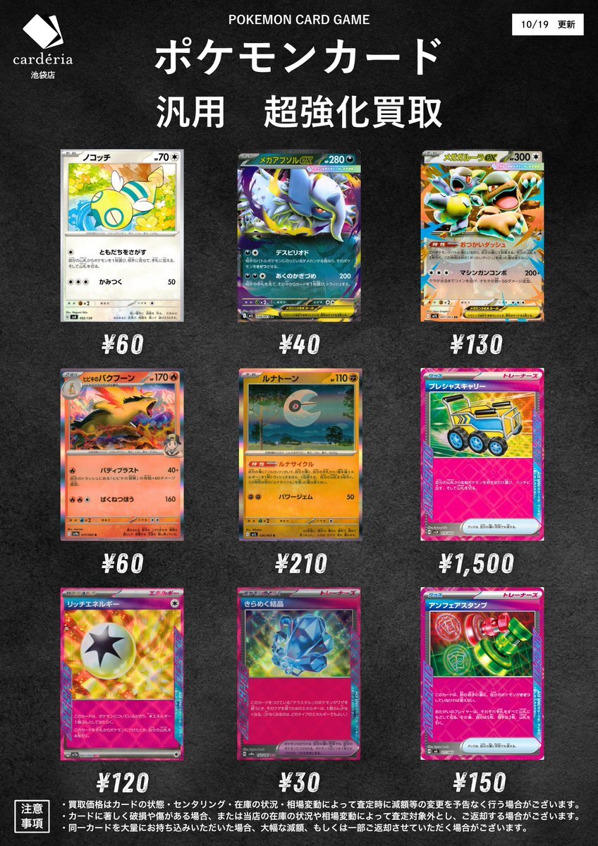 📣ˎˊ˗ ポケモンカード 買取表更新!✨ 買取表の汎用デッキパーツを強化買取中! 超強化高価買取中🔥 092/139 ノコッチ¥60 038/063 メガアブソルex¥40 051/063 メガガルーラex¥130 017/063 ヒビキのバクフーン¥60 026/063 ルナトーン¥210 015/022 プレシャスキャリー¥1,500 064/064 pic.x.com/Oyq1HZyh7U