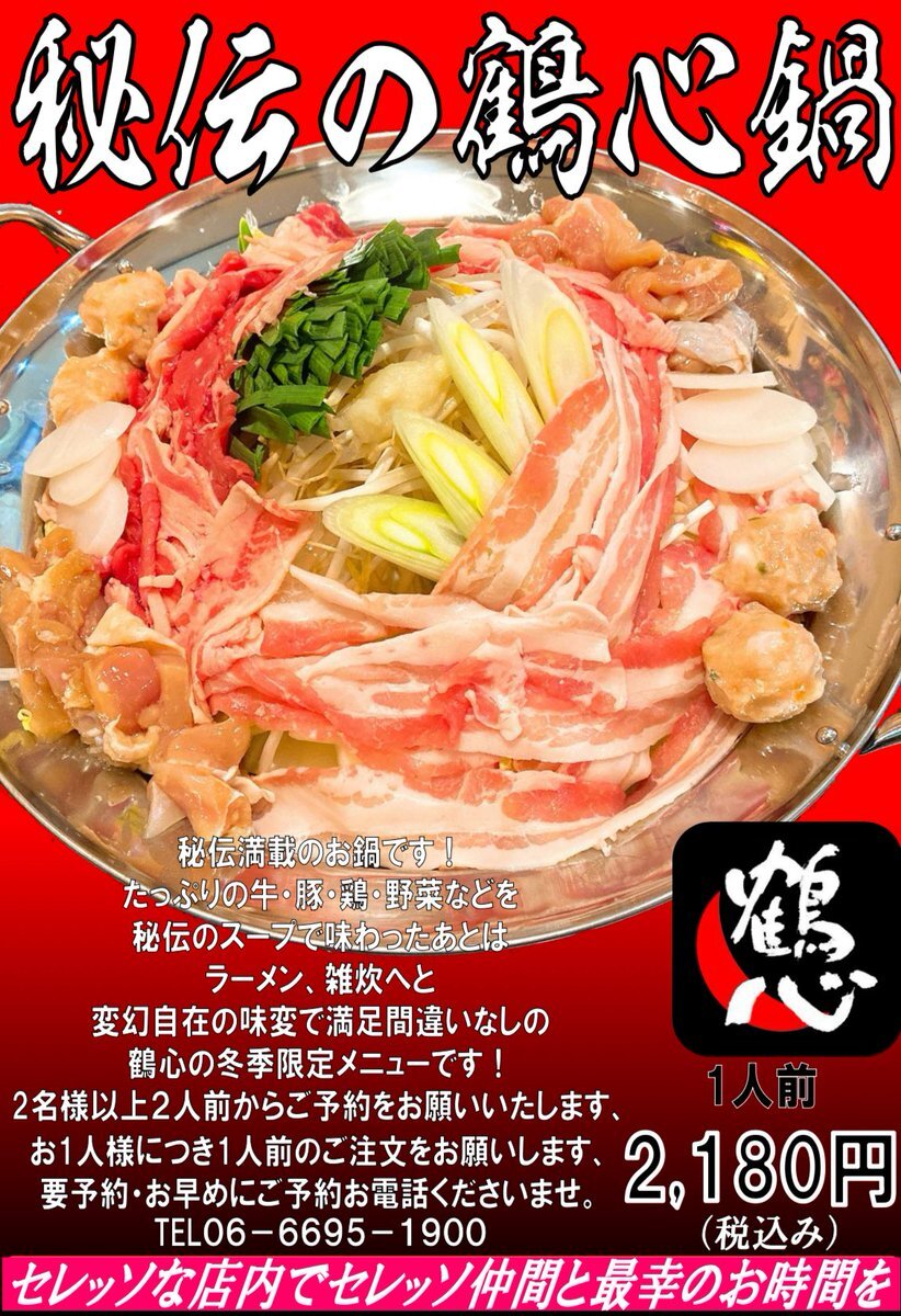 【拡散ご協力お願いします🙇♀️】 鶴心あびこ店です😃 お待たせしました‼️ 2025年の鶴心鍋のご予約の受付をスタートいたします😍 🌸ご予約は2名様以上、お1人様につき1人前のご注文をお願いします。 ※最大20名様ぐらいまでご利用いただけます。 ☎️ご予約お電話 0666951900 までお願いいたします🙇♀️