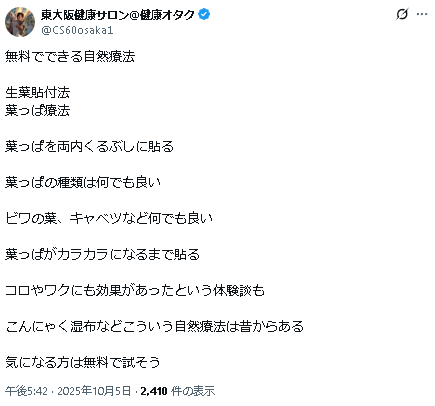 葉っぱの種類は何でも良いということなら、 言い出しっぺがウルシやイラクサやジャイアントホグウィードでやってみてください。 自然療法は根拠ない情報で逆に健康を損なうという危険性があります。 信用しないように。 x.com/CS60osaka1/sta… pic.x.com/0kFvGHX445
