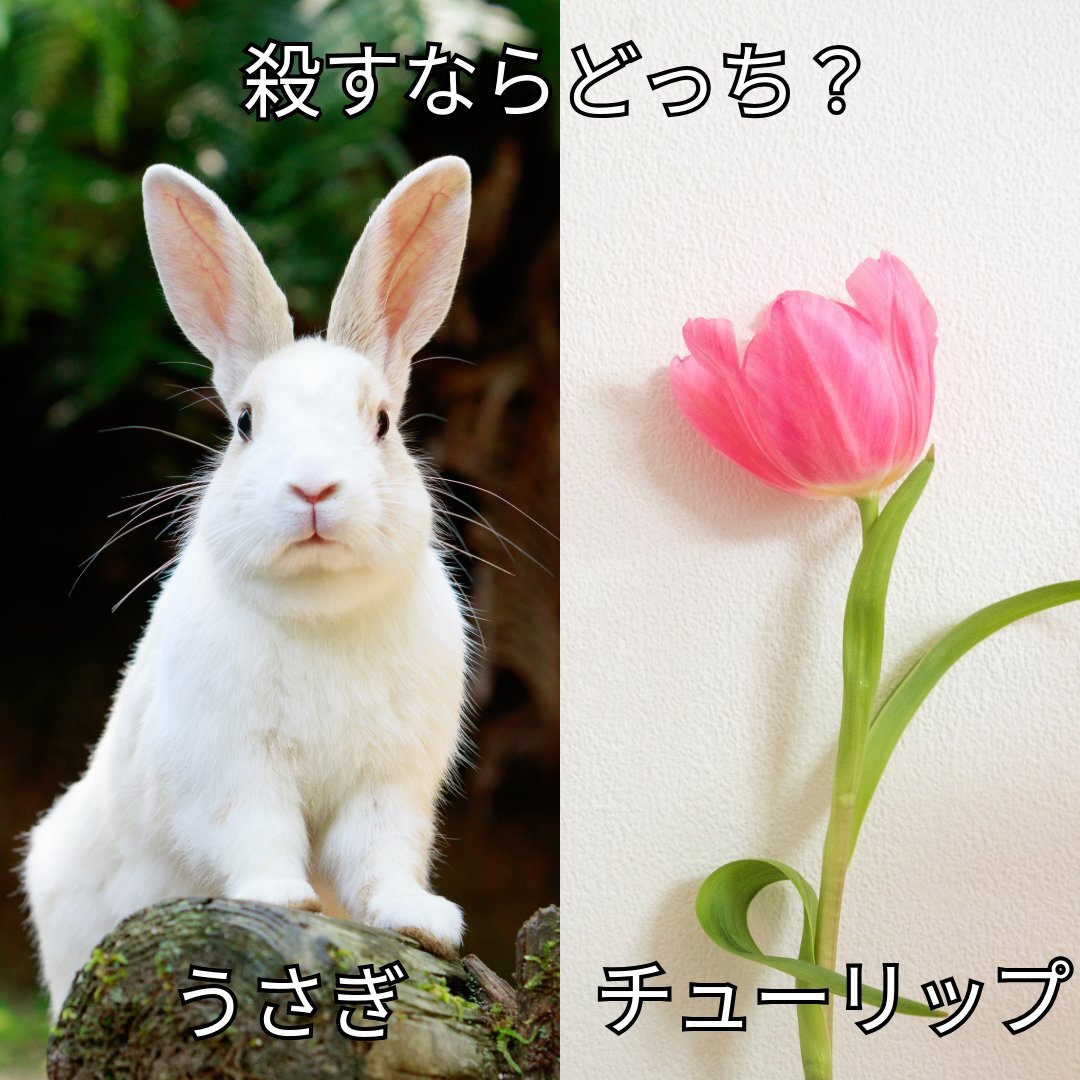 心理クイズです。あなたの目の前に生きている可愛いウザギとチューリップがあります。誰かがあなたの頭に銃を突きつけて、「どちらか踏み潰せ、さもないとお前を殺す」と言ったらどちらを踏み潰しますか?