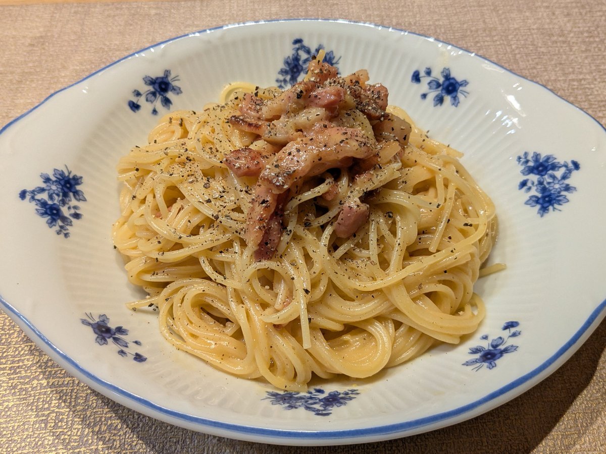 初めてジローラモみたいな名前のベーコン(パンチェッタ)を使って作ったカルボナーラ さすがジローラモ。コンビニで買ったやつなのに塩気の質と脂の旨味が違う。気がする! pic.x.com/qMM1jAmh8I