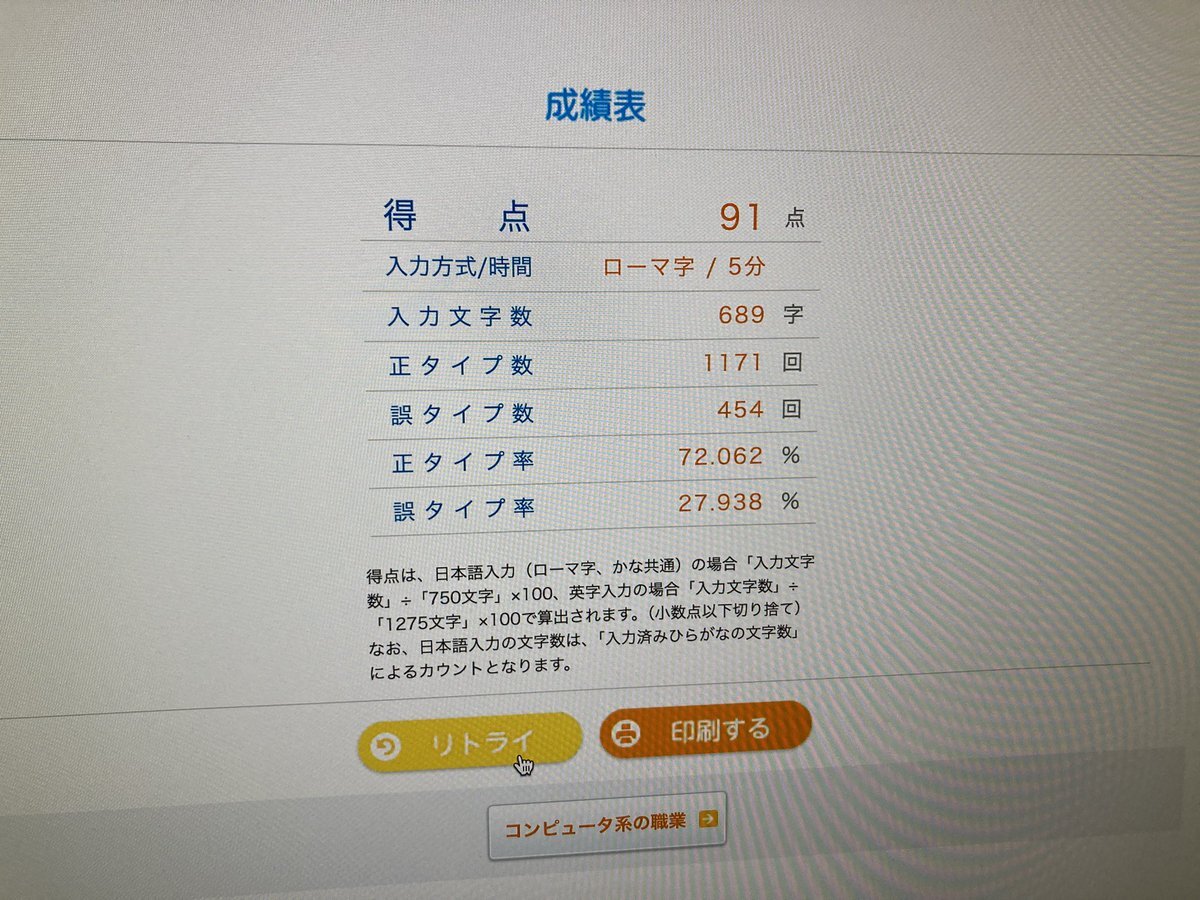 ほんとにえらいこっちゃよ 残り10秒とかでギリギリ打ち切るんだよね速度、2級むずいよ 明日しかも朝だよ、寒いよ指動かないよ、タイピング練習して寝る