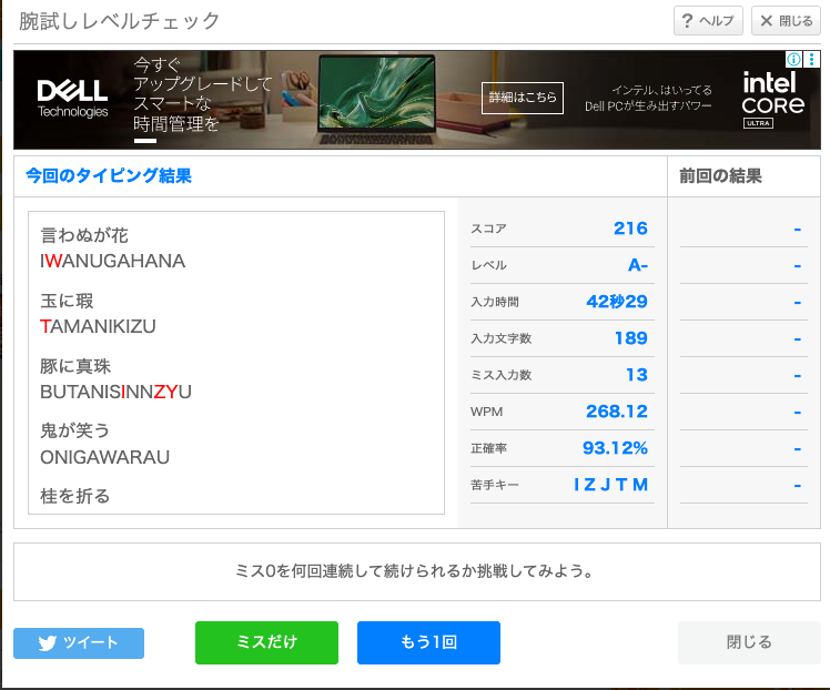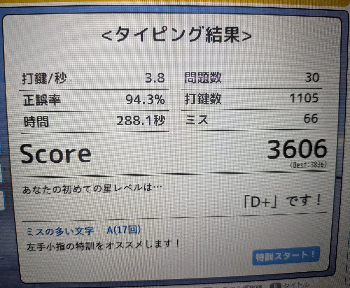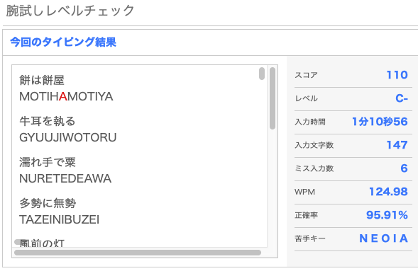 しばらくタイピングゲームをしていなかっただけで、感覚で打てていたような単語でミスをするようになってしまいました。 タイピング自体はしていたはずなのですが、速度や正確性を気にせず打っていたので変な癖がついてしまったみたいです。 やっぱりタイピング練習を続けるのは重要……。