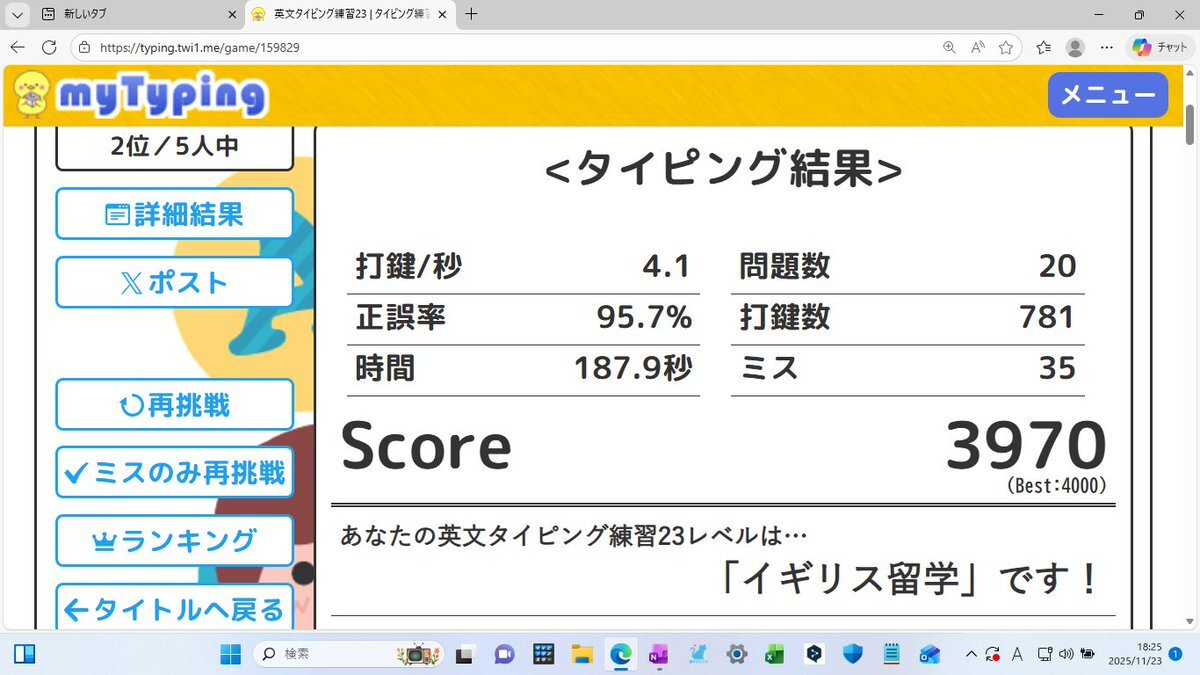 今日のタイピング練習は「イギリス留学」レベルでした!ランキング5人中2位獲得! #英文タイピング練習23 typing.twi1.me/game/159829 スコア 3970点 正誤率 95.7% (ミス 35打) 速度  4.1打/秒 時間  187.9秒 #マイタイピング pic.x.com/SXB3y05UaL
