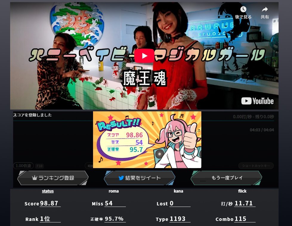 【魔王魂公式】ハニーベイビー!マジカルガールの動画でタイピング練習や歌詞の確認ができるよ! #タイピングチューブ typing-tube.net/movie/show/678… 魔王魂のハニーベイビー!マジカルガールをタイピングチューブでプレイできるようにしました。 魔王魂曲の中でもトップ3に入るぐらいの難関曲です。
