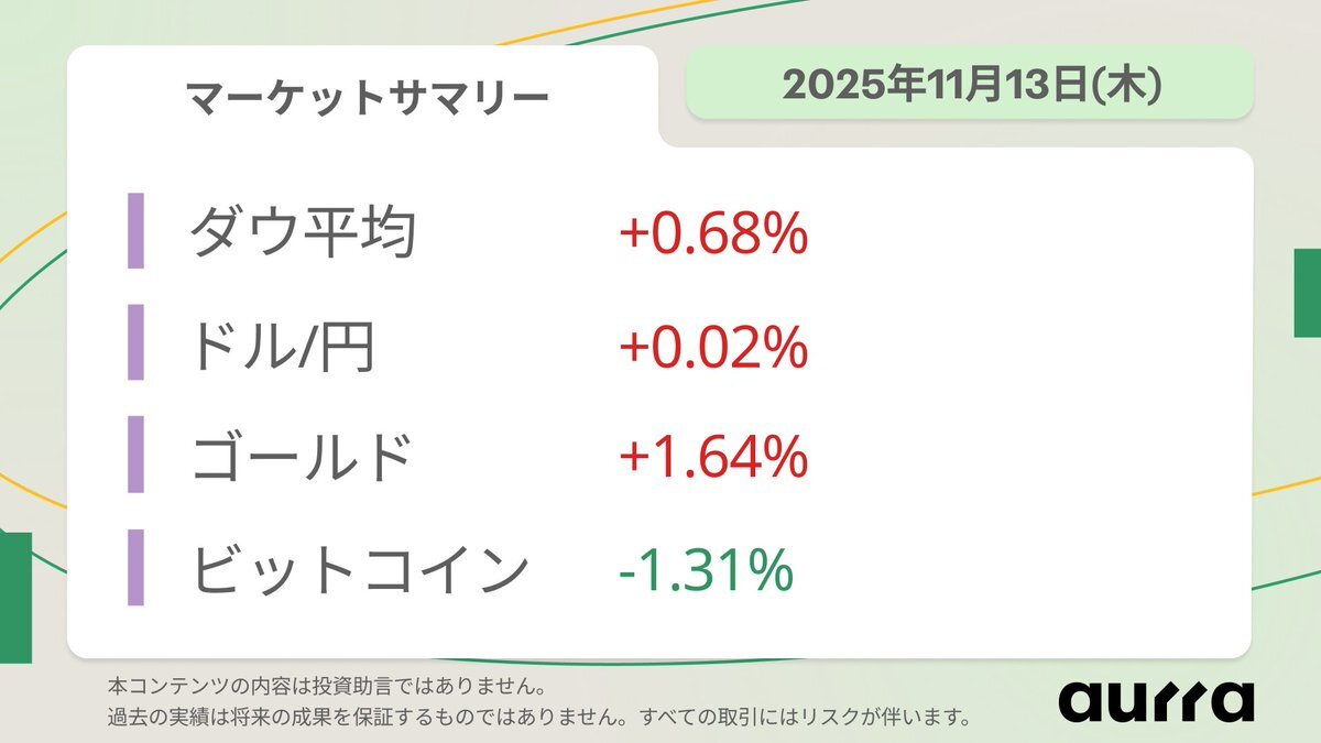 🌎 マーケットサマリー|2025年11月13日(木) 10:10 JST トレーダーは #政府閉鎖 終了への採決に注目、市場は神経質な展開。 📈 ダウ平均 $DJX は +0.68%、初めて48000超えで引け 💱 #ドル円 $USDJPY は +0.02%、9カ月ぶり高値圏で推移 🧈 ゴールド $XAUUSD は +1.64%、上昇を続け4200ドルに接近 🪙 pic.x.com/sTQcxogII6 x.com/aurra_jp/statu…