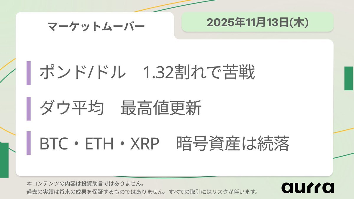 🔥 マーケットムーバー|2025年11月13日(木) 10:14 JST ▪英ポンド/ドル $GBPUSD は1.32を下回り苦戦、ユーロ/ドル $EURUSD は1.1600付近をテスト。 ▪#米国株 ではダウ平均 $DJX は過去最高値で引け、S&P500指数 $SPX は小幅高、ナスダック $NDX は重荷が続く。 pic.x.com/DmM1xd8YlO
