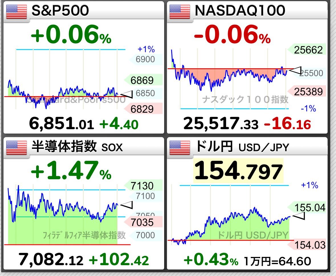 東京市場は堅調か。 米国株はまちまちで、ダウ平均とS&P500は上昇、ナスダックは下落。 つなぎ予算案の下院採決見通しが安心材料となり、ダウは連日で史上最高値を更新。 一方、パランティアなどAI関連は弱い。 ドル円は154円70銭前後で推移、円安傾向。 CME225先物は円建て51255円。 @zoo6kmd3v