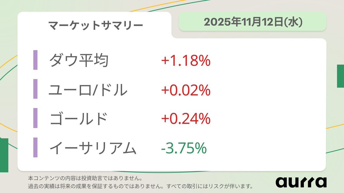 🌎 マーケットサマリー|2025年11月12日(水) 10:11 JST 米上院、 #政府閉鎖 終了へつなぎ予算案を可決。 📈 ダウ平均 $DJX +1.18%、法案が下院送付で買い優勢 💱 ユーロ/ドル $EURUSD +0.02%、米指標失望で小幅上昇 🧈 ゴールド $XAUUSD +0.24%、 #米ドル 軟調が支え 🪙 イーサリアム $ETH x.com/aurra_jp/statu…