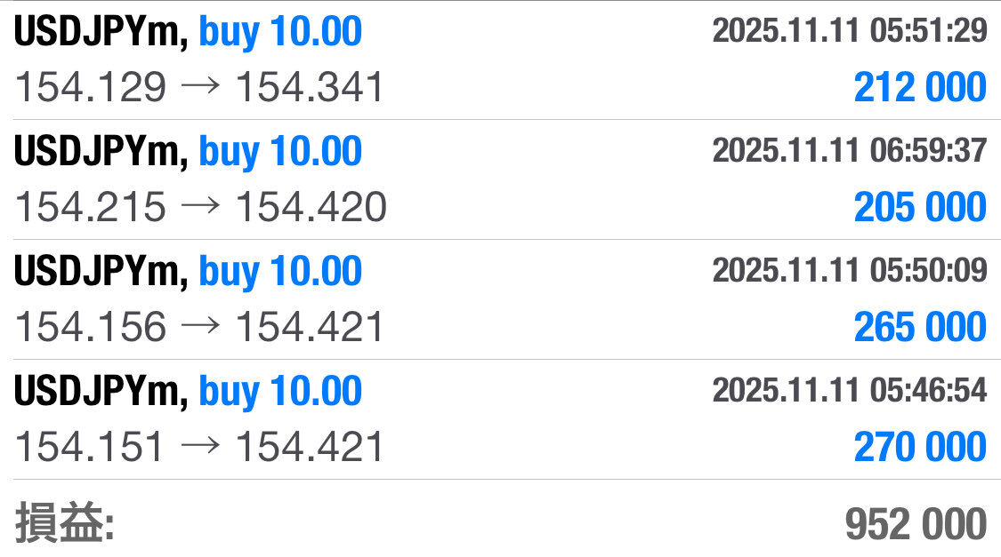 11/11 ドル円トレードの結果… +95万円でした🚀 狙い通りの押し目を拾えて、 しっかり上昇してくれましたね。 利確できたフォロワーさん、 おめでとうございます👏👏👏 #USDJPY #XAUUSD BTC EURUSD ビットコイン BTC x.com/konno_wataru_F…