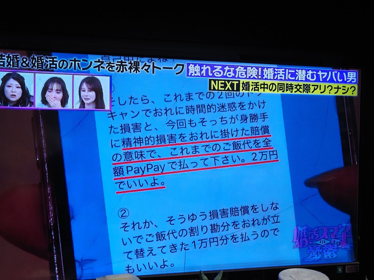 土曜深夜にテレ東で婚活沼とかやってたが視聴率気にしないと思った局が女に媚び売ったのは失望した。別れ告げられた男が「損害賠償」と言い出したコトに「酷い〜」とかスタジオで声上げたり。言葉は適切じゃないが「金返せ」くらい至って普通の言い分。ダレノガレ明美も「何様?」と言いたくなる言い草 pic.x.com/HLNGeidgqe