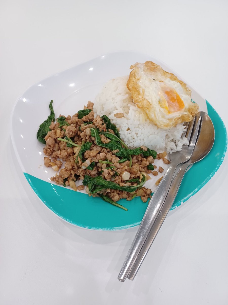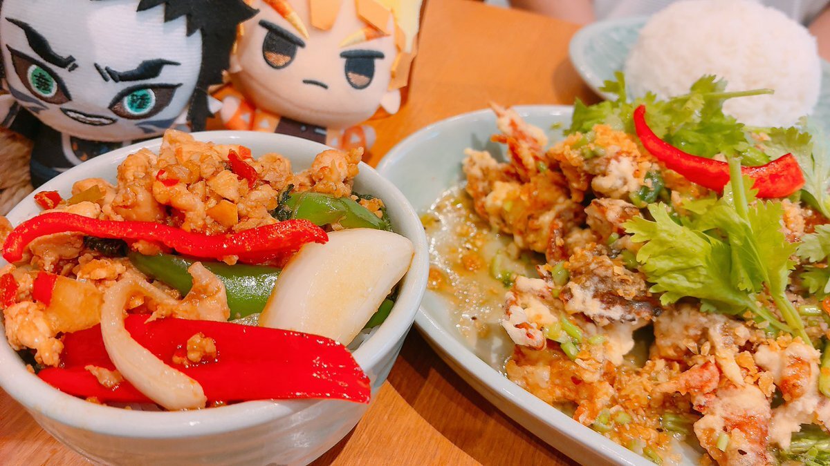 プーニム・ガティアム(やわらかいカニのにんにく炒め)とジャスミンライスとミニガパオライス〜 辛くて美味い!(鬼を日中に連れ出してごめん) pic.x.com/IV0qll8Lqa