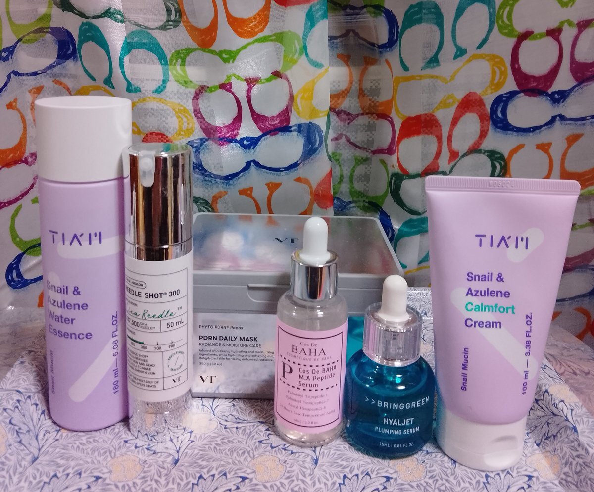 10/7 夜のスキンケア ティアム スネイルアズレンウォーターエッセンス VT リードルショット300 VTPDRNディリーマスク コスデバハ ペプチドセラム(おでこの部分使い) ブリングリーン HPセラム ティアム スネイルアズレンカームフォートクリーム #スキンケア #40代 #フェイスマスク pic.x.com/JLY5zlcACL