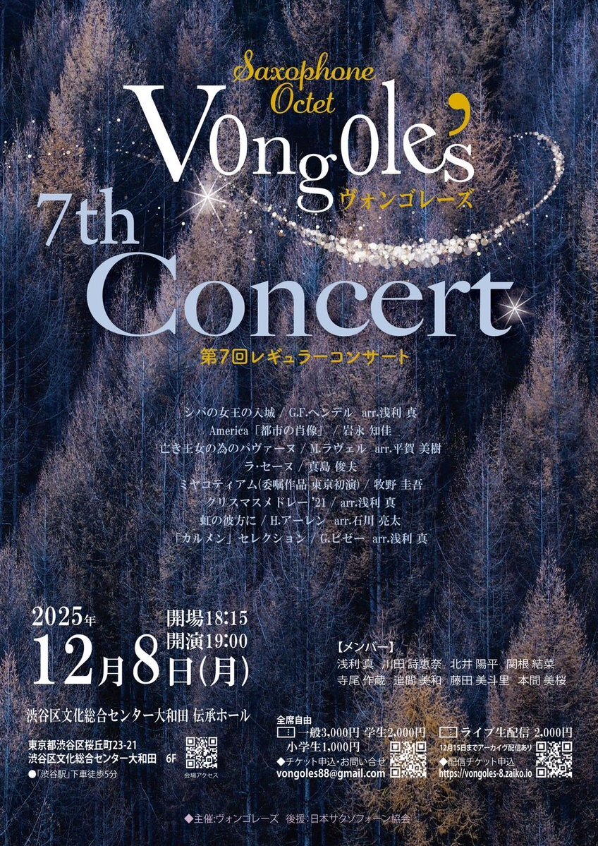 【ヴォンゴレーズ7thコンサート🎷】 2025年12月8日(月) 18:15開場 19:00開演 ●プログラム ラ・セーヌ/真島俊夫 ミヤコティアム(委嘱作品 東京初演)/牧野圭吾 クリスマスメドレー'21/arr.浅利真 「カルメン」セレクション/G.ビゼーarr浅利真 他 pic.x.com/UTQTMnfHJz
