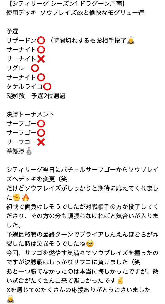 シティリーグS1 in ドラグーン周南 使用サーフゴー ️⭕️タケルライコ ️⭕️ドラパリザ ️⭕️ルカリオ ️⭕️サーフゴー ️⭕️サーフゴー ❌サーフゴー 予選3位抜け トナメ ️⭕️バチュバレ ❌ソウブレイズ ベスト4にて終了 応援してくださった皆さんありがとうございました!めちゃくちゃ励みになりました😭