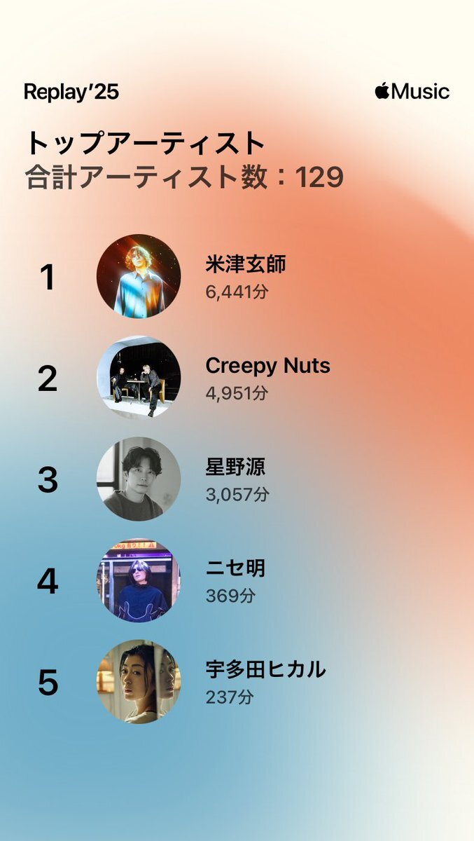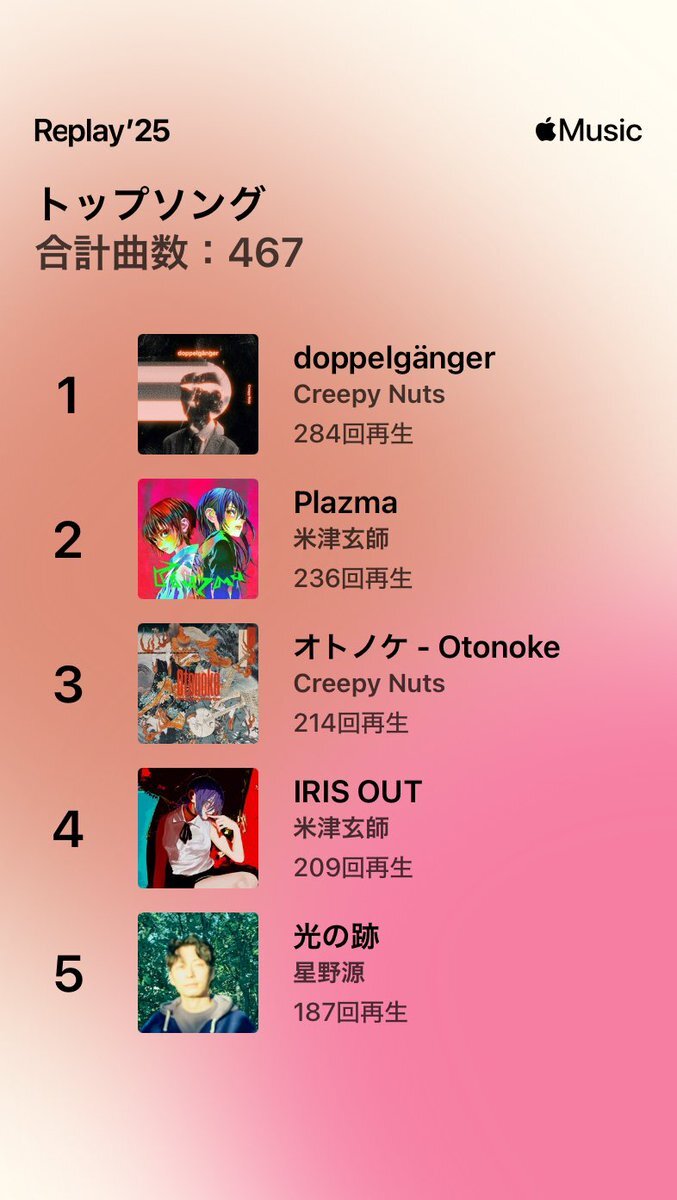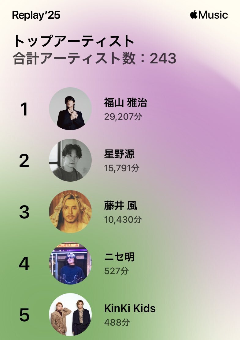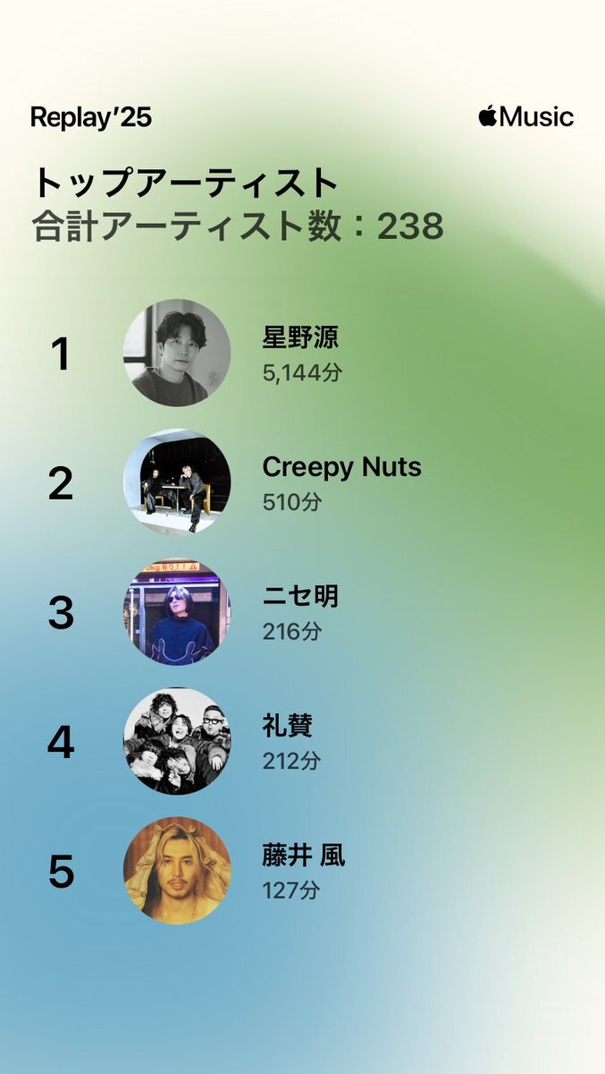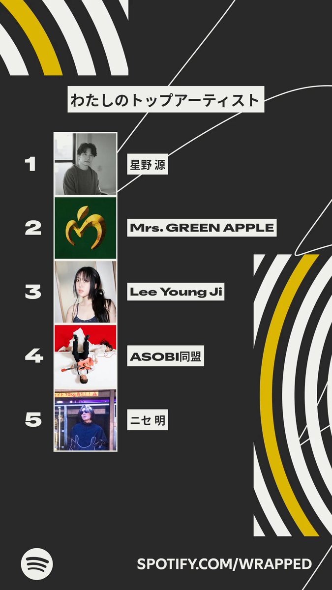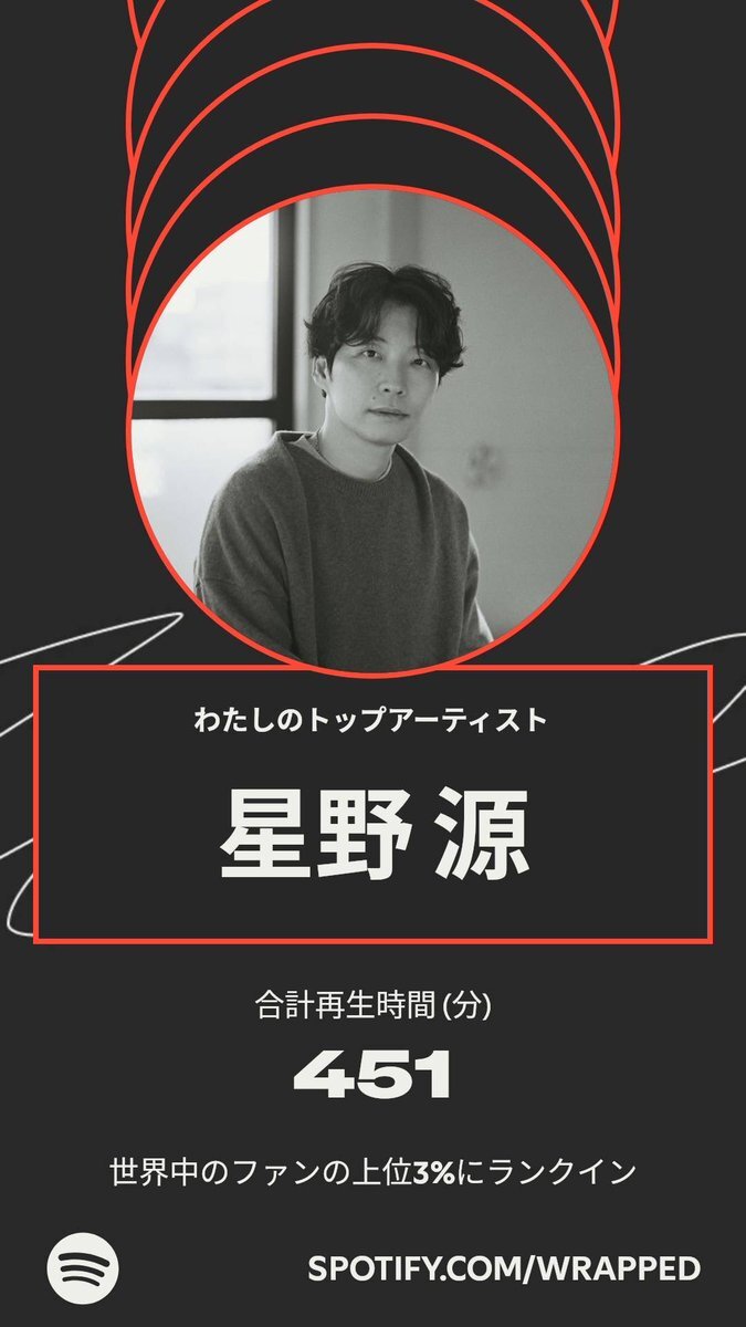 今年も源さんめっちゃ聴きました! いつもお世話になってます!! 来年も聴き続けます!! しかし2曲(といっても『Fake』が2バージョン)だけで礼賛を4分上回って3位に食い込んでるニセさんがスゴイ😂😂😂 #星野源 #ニセ明 pic.x.com/a3IOcX6usT
