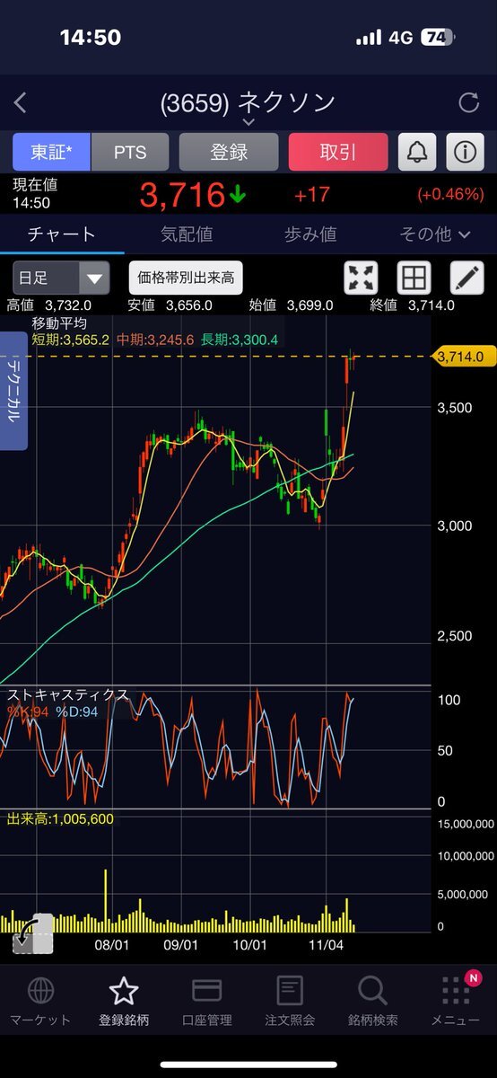 観測範囲でVWAPより上にいる子 NTT、KDDI、SHOEI、ユニチャーム、ペプチド、資生堂、ゼンショー、セガサミー、ネクソン、CRIミドル、三浦工業、千代田化工建設。JES、DeNAとかが当落選上