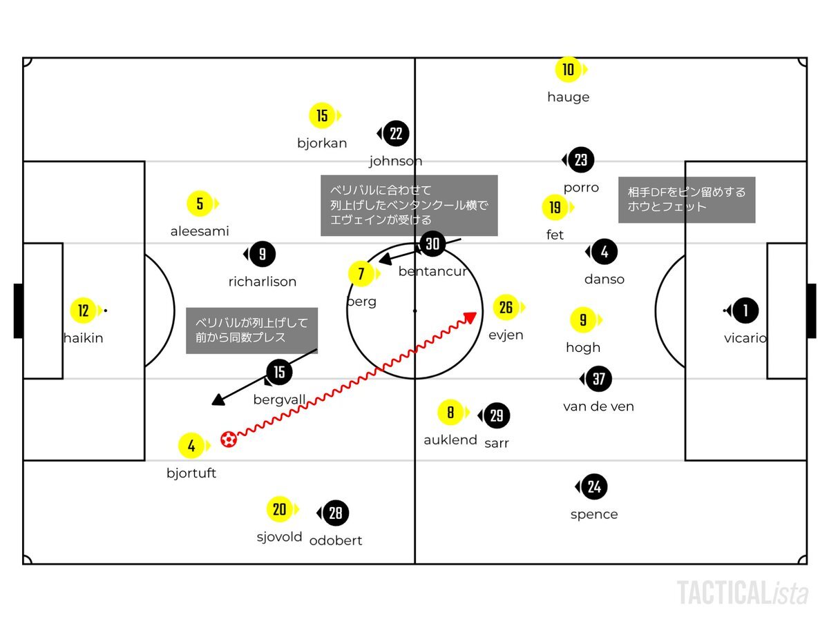 スパーズは自分らがやられたのを返すように、RBとRCBの数的優位を活かして右から攻め立てる。ポロが内側、クドゥスが外に立つのだが、ボードー左サイドのハウゲとビョルカンは中と外のどっちを切るのか曖昧なままで結局どちらも制限できず、後手を踏んで2vs2でスパーズ右ユニットに攻め込まれる。