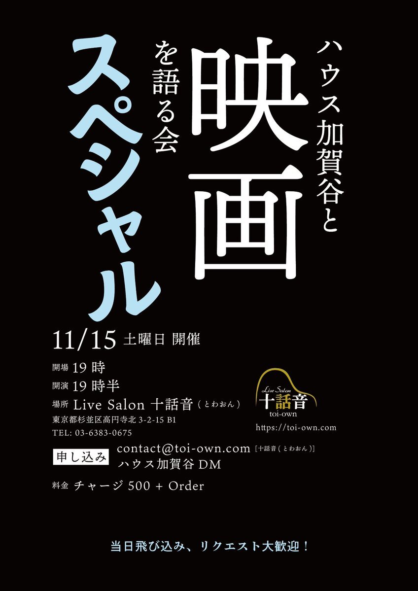 ★映画を語る会スペシャル★ ハウス加賀谷が選んだ映画をみんなで語ります! 今回は「北野武監督作品特集」です! 11月15日 土曜日 開催 開場19時 開演19時半 場所 Live Salon 十話音(とわおん) 東京都杉並区高円寺北3-2-15 B1 TEL: 03-6383-0675 contact@toi-own.com 料金 チャージ500 + Order
