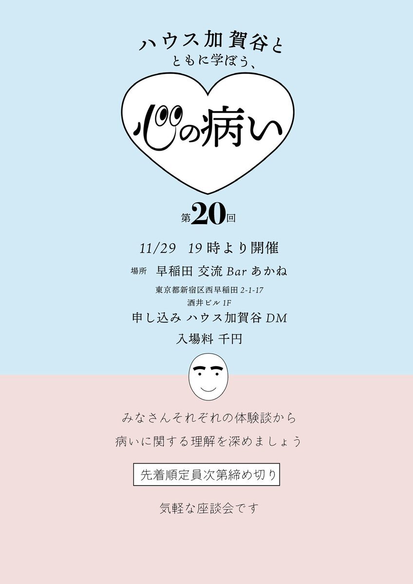 第20回 ハウス加賀谷と共に学ぼう、心の病い 11/29 19時より開催 場所 早稲田 交流Barあかね 東京都新宿区西早稲田2-1-17 酒井ビル1F 申し込み先 ハウス加賀谷DM 入場料千円 みなさんそれぞれの体験談から病いに関する理解を深めましょう 先着順定員次第締め切り #精神疾患を持つ方と繋がりたい pic.x.com/6mr22TCyCf