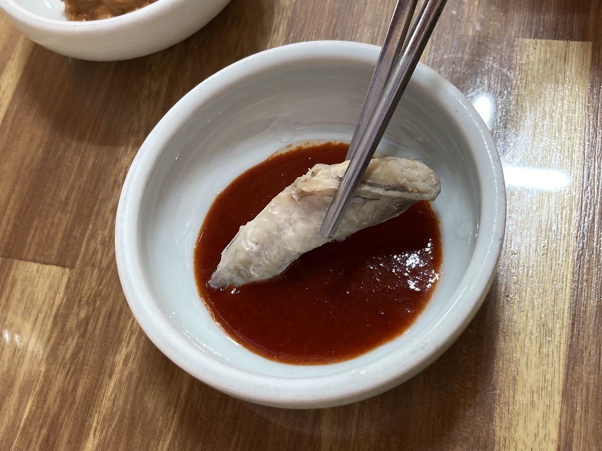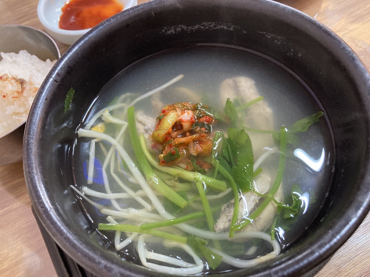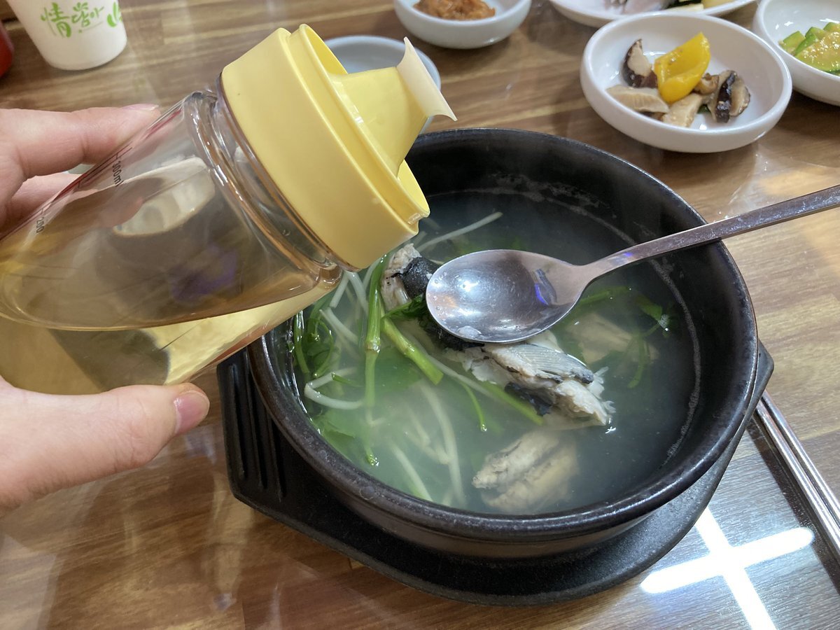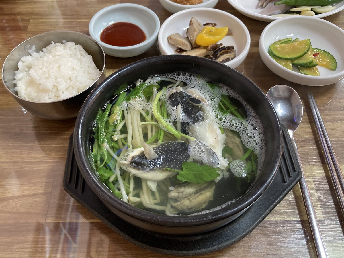 とはいえ、このさっぱりしたスープはやっぱり朝向きなので、その可能性も念頭に統営名物のチョルボックッ(ヒガンフグのスープ)もチェック。小さなフグですが、身の食べごたえは充分。途中で酢を入れたり、ネギの薬味を足したりすると、さらに味が深まりました。さて、本番ではどちらを食べましょう。 pic.x.com/r300R5JfOR