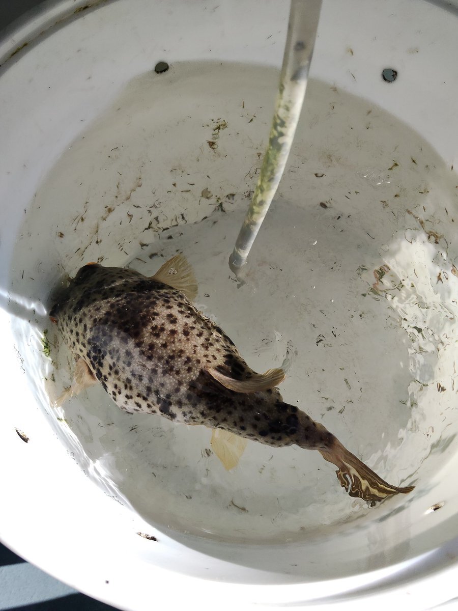 返信先:@kanadekaitoかいとくんからリプもらって改めてみたらヒガンフグでしたぁ!!フグ免許あるからさばいて鍋にでもしよかしら(*'ー'*)!え?!難しいのか……わりとすぐ釣れたからこの子は多分鈍臭いかも笑(*´°∀°`)