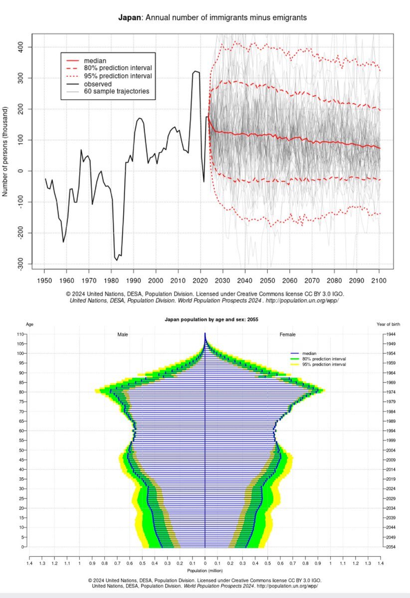 現状移民流入数が一番上の赤線レベルに来ているため、20代〜60代の世代人口は一番外側の黄色が最も現実的なシナリオ その場合、出生率が恒常的に0.8とかにでもならない限り1億人割れは2075年前後 そうなると70歳以上の割合も今後30年で5%程度上がったらそこでピークアウトする pic.x.com/5bjPBRtQCg x.com/yz7sha/status/…
