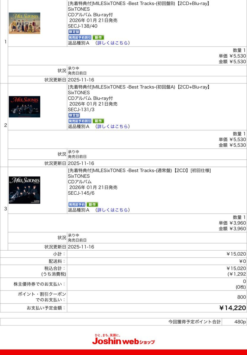 Joshin web様 ・ビルボオリコン反映 ・原則フラゲ可能 ・先着特典付 ・定価17,292→15,020 ・私は🈹🅿️駆使で14,220 ・定価の約20%(3,000円)OFF 神すぎるよね…1度ダンボール📦 破けてきたことあるけど許すよね。 さあ、予約完了しました! 金欠民はJoshinで早めの予約!! #SixTONES_MILESixTONES pic.x.com/70rA67jBy7
