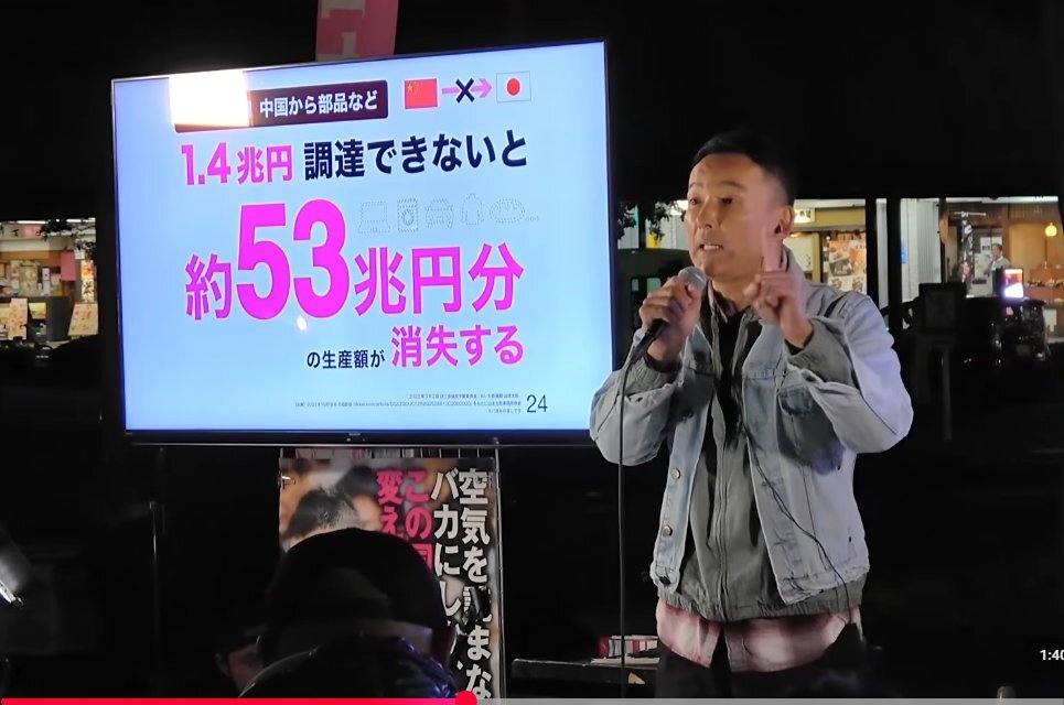 これは10/29、横浜市本郷台駅前で行われた「れいわ新選組」山本太郎代表による街宣の一コマだ。 スーパーコンピューター「富岳(ふがく)」の試算によると、中国から2か月間、1.4兆円の部品が調達できないと、日本国内では「約53兆円分」の生産額が喪失されるという。 x.com/shirasaka_k/st…