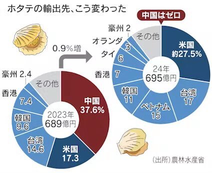 返信先:@YoichiTakahashi中国禁輸で余ったホタテ、海外で人気 輸出2倍で卸値最高 月の輸出額は前年同月の2倍で、中国向けの減少を補うかたちで米国やタイ、ベトナム向けが大幅に増えた。国内外で需給が引き締まり、豊洲市場の卸値は過去最高値を付けた。 pic.x.com/ZccZIcL6NW