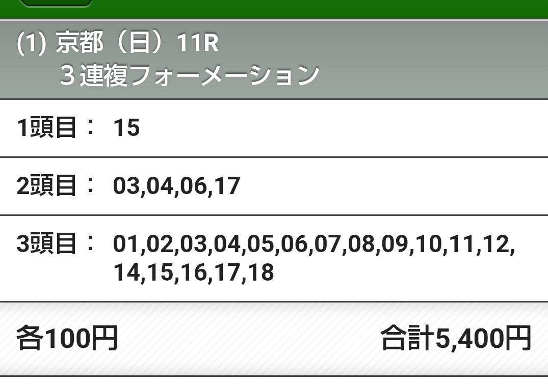 マイルチャンピオンシップを購入🐴➰💨。15ジャンタル→3ウォーター、4マジック、6ガイア、17ソウル→全通り3連複。押さえはジャンタル⇔ウォーター、マジックの馬単裏表。ウォーターかマジックの後方一気⚡️が炸裂するはず。当たれ~🎯😆‼️ pic.x.com/ElKGEpjNcT