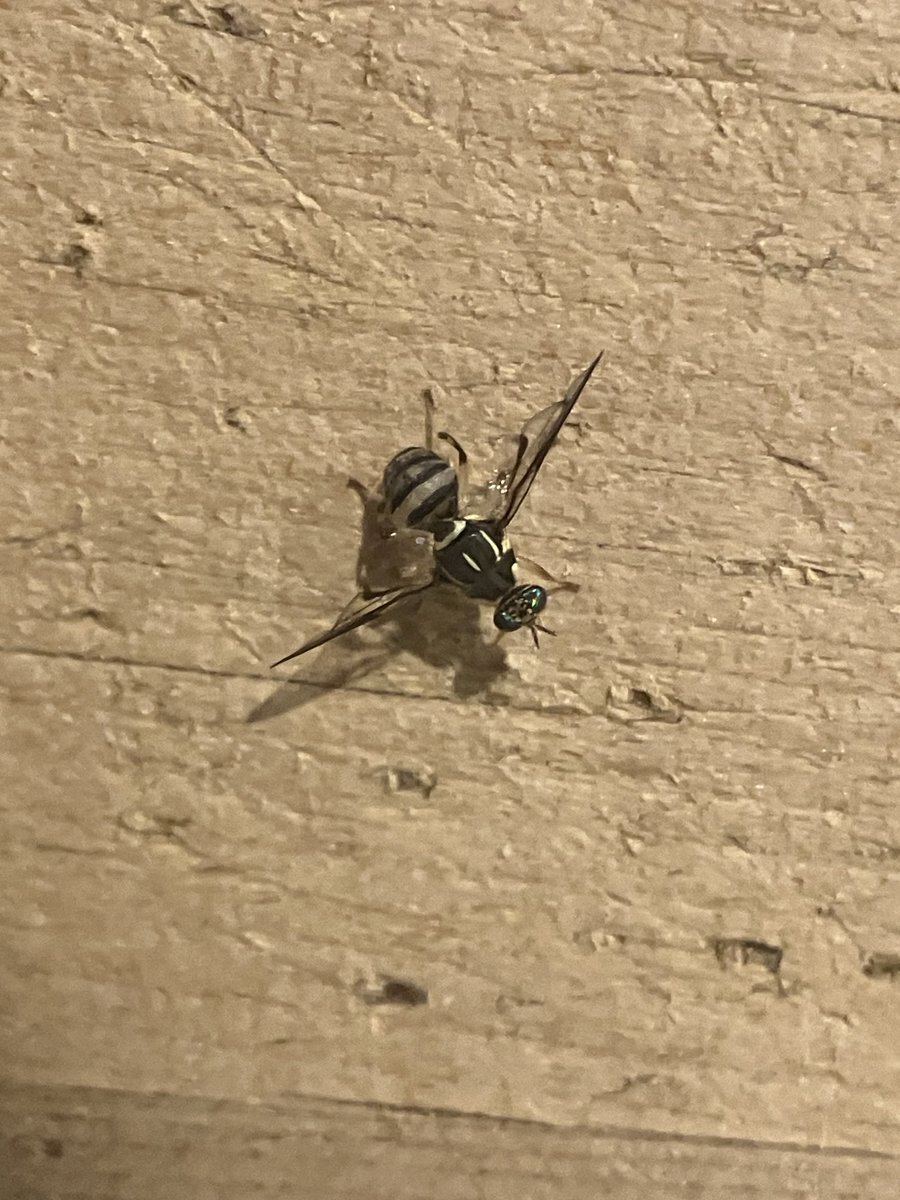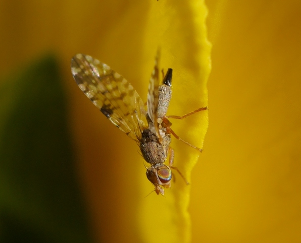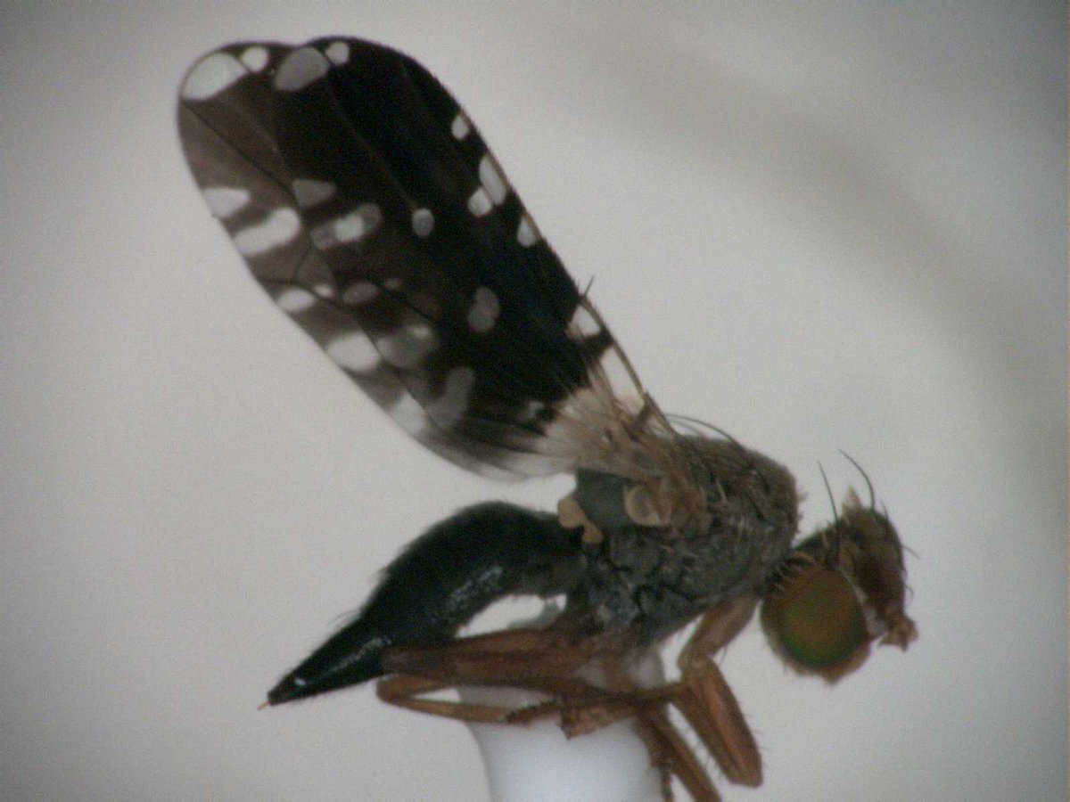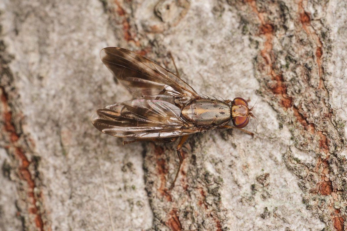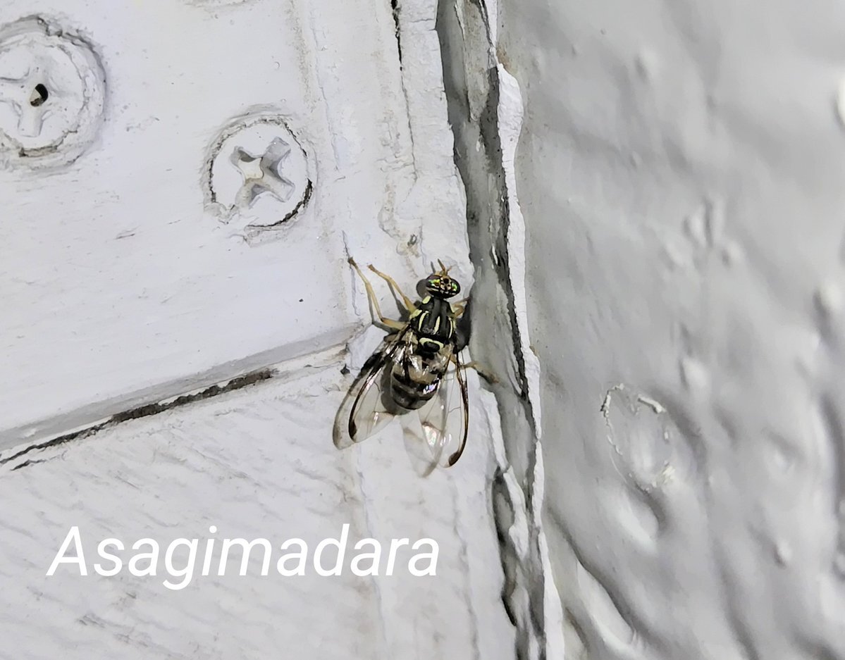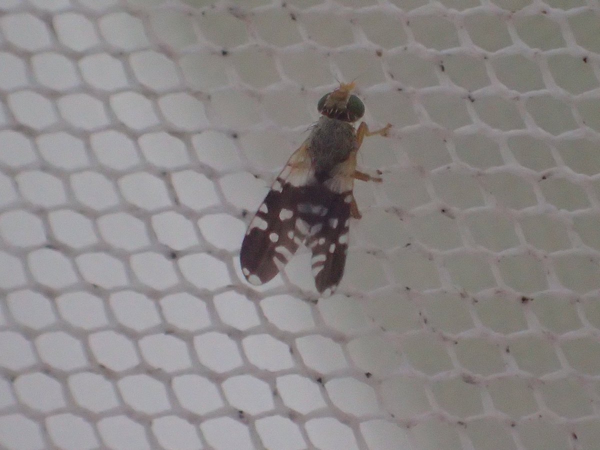 ネッタイヒメクロミバエ この時期でも採集できる南国系のミバエ 上翅先端の透明斑は1つに融合する個体とこの個体のように分離する個体がある気がする ミバエあるあるの表記揺れで和名をネッタイクロミバエとする人も見られる pic.x.com/w2HNh7ZpDq