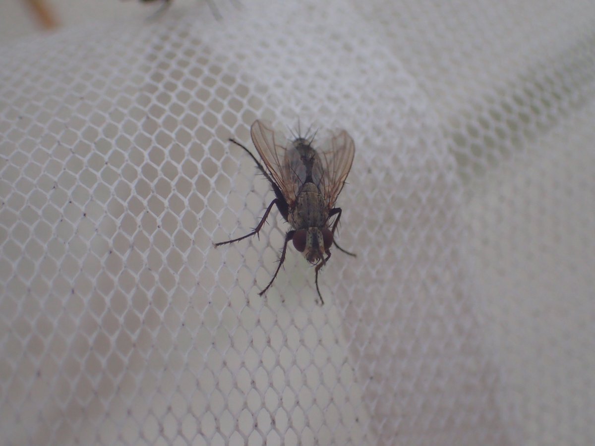 今日はハエも多くて、一網で、20匹くらい入ってくることもあった。こちらの翅の綺麗なハエはミバエかなあ?2枚目は、体表の剛毛が目立つ一方、顔は割とスッキリ顔。これもヤドリバエのなかま? pic.x.com/6zXecW671A