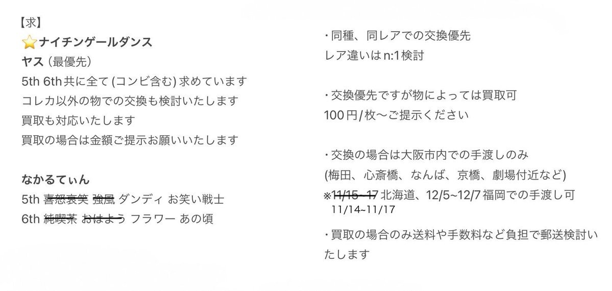 よしもとコレカ 5th 6th 交換 買取 【求】ナイチンゲールダンス ヤス 【譲】画像参照(2~3枚目) 大阪市内手渡しのみ 北海道福岡での手渡しも可(日程1枚目記載) お心当たりある方からのご連絡お待ちしています