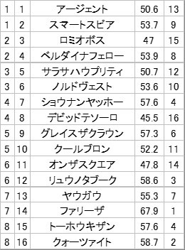 ?③ロミオボス(113.5) ?④ベルダイナフェロー(64.5) ?⑥ノルドヴェスト(20.5) ?⑦ショウナンヤッホー(20.9) ?⑧デビッドテソーロ(116.0) ?⑬ヤウガウ(102.0) ?⑮トーホウキザン(18.9) ▼⑯クォーツァイト(40.0)
