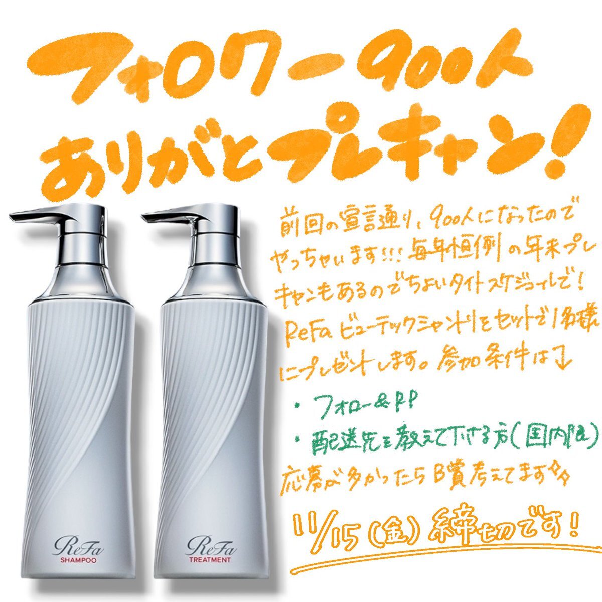 \ プレキャンはじまるよ / フォロワーさん900人記念プレキャン💗 嬉しい!みんないつもありがとう! リファのビューテックシャンプー&トリートメントをセットで1名様にプレゼント🎁大好きなシャントリだから布教させて〜! 詳細は画像で確認してね🎀✨ たくさんの応募お持ちしてます💋
