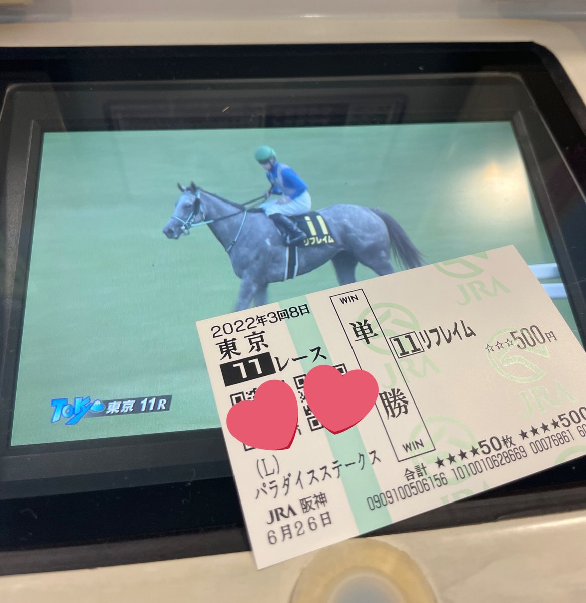実は競馬場でのリフレイムちゃんの写真これしかないんよね…🥺 この日人生で初めて競馬場行って、あ!この子Twitterでおもしれー女って話題の子だ!と思って馬券買ったんよね😌 その頃はまだメロディーレーンちゃんとポタジェくんとソダシちゃんくらいしか知らなかった🤔 pic.x.com/aIovKeQINi