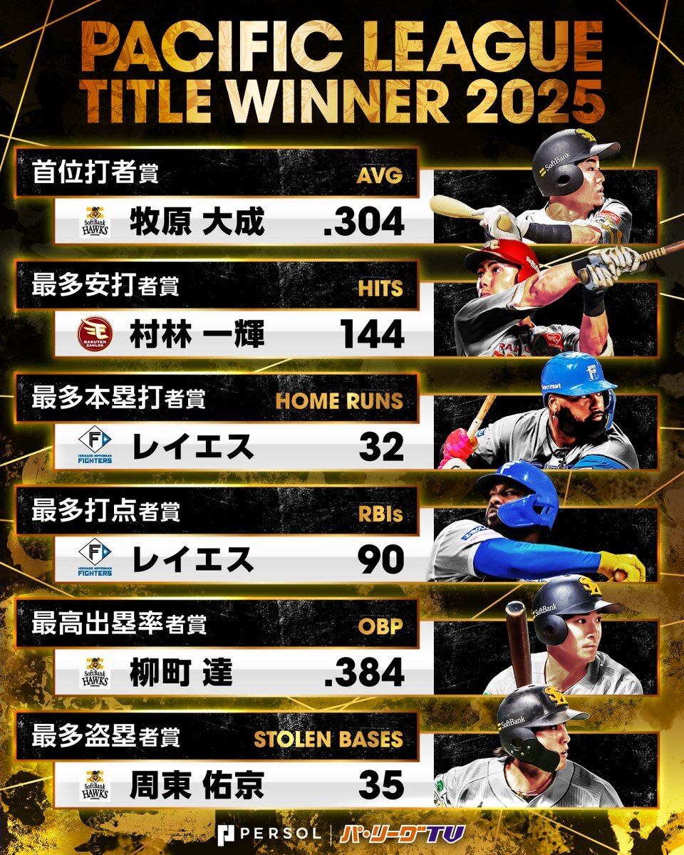/ 2025年 パーソル パ・リーグ 野手個人タイトル表彰選手🏆 \ 首位打者賞 H #牧原大成 選手(初受賞㊗️) 最多安打者賞 E #村林一輝 選手(初受賞㊗️) 最多本塁打者賞 F #レイエス 選手(初受賞㊗️) 最多打点者賞 F #レイエス 選手(初受賞㊗️) 最高出塁率者賞 H #柳町達 選手(初受賞㊗️) 最多盗塁者賞