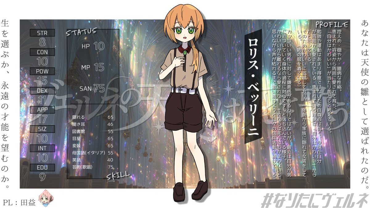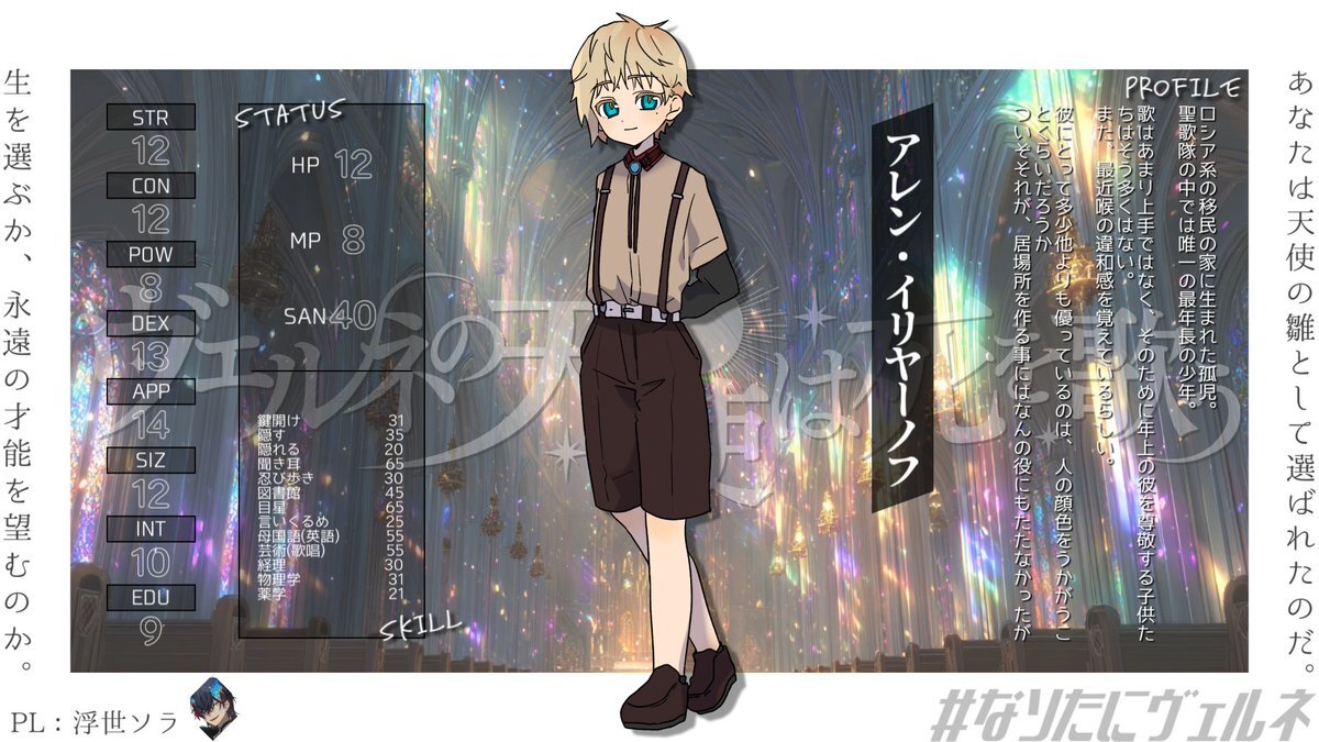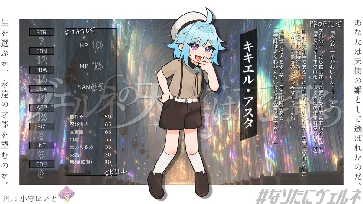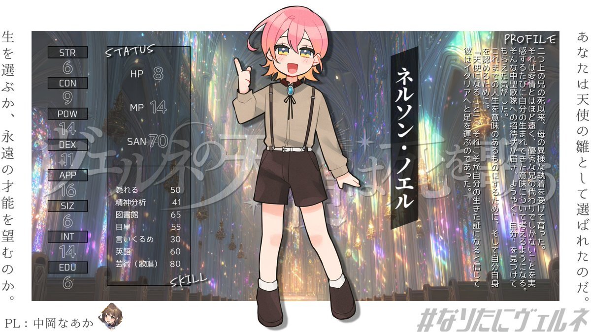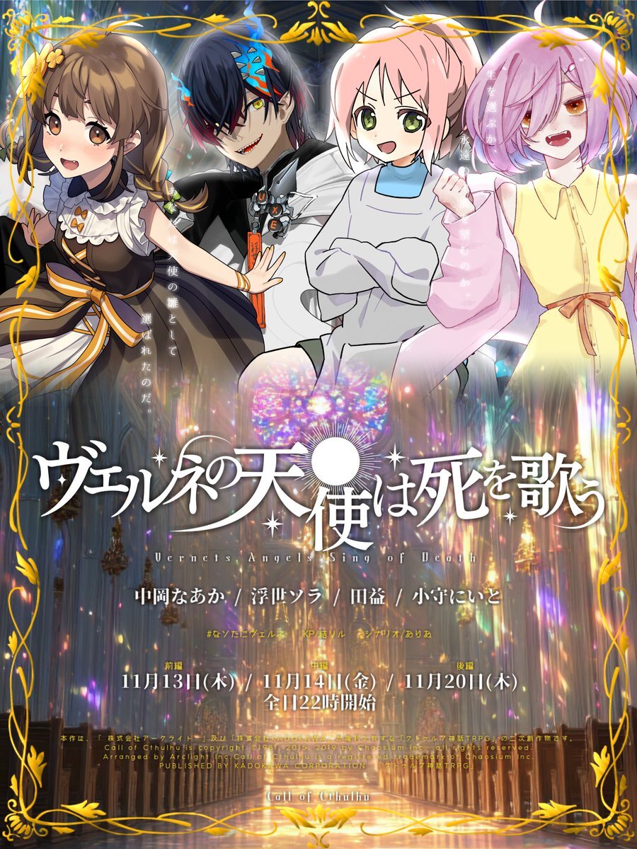 【⛪配信告知⛪】 クトゥルフ神話TRPG 『ヴェルネの天使は死を歌う』 ――生を選ぶか、永遠の才能を望むのか。 #なソたにヴェルネ ✦PL 中岡なあか@7naaka 浮世ソラ@UkuseSolla 田益@at_tetom_ctr 小守にいと@dareyanen210 ✦日時 全日22時開始 11/13 (木) ・ 11/14 (金) ・ 11/20 (木)