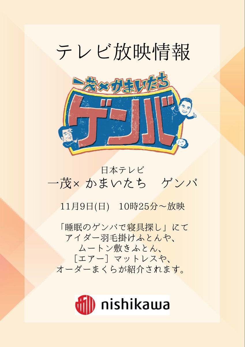 日本テレビ「一茂×かまいたち ゲンバ」 11月9日(日)10:25~放映にてnishikawaのアイダー羽毛掛けふとんや、オーダーまくらが紹介されます! pic.x.com/KRKltWcGOz