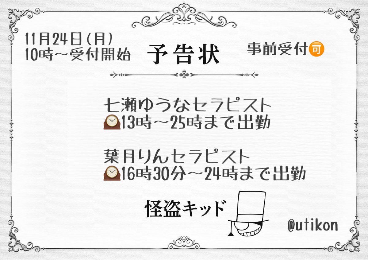 ☆11/24(月)出勤予告!!★ 今宵、あなたの疲れを頂きに参ります。ウチこんの下で会いましょう。 「ウチこん」再出勤 💚七瀬ゆうなさん💚 「ウチこん」再出勤 🧡葉月りんさん🧡 Ladies and Gentlmen! さあ、ショーの始まりだぜ!! ご予約お待ちしております♪♪ #怪盗キッド pic.x.com/s3phsW0BcC