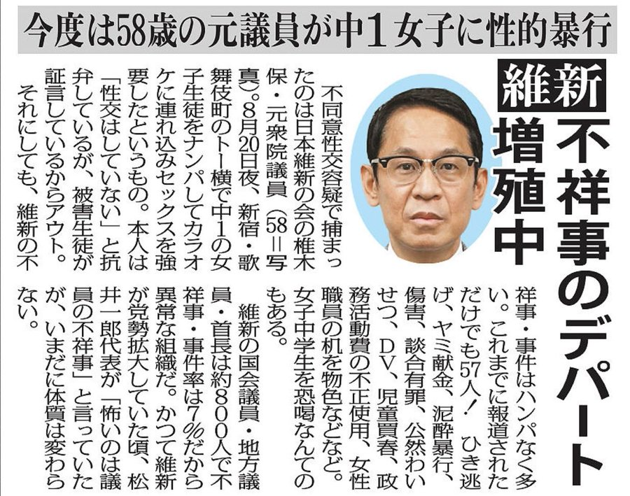 性犯罪は維新の会の一丁目一番地。セクハラ・ストーカーの笹川理、児童買春、児童ポルノ所持の三浦一成、女子高生3人に下半身を露出の赤坂大輔、他にも山ほどある。 pic.x.com/mcS6E4Yvcl