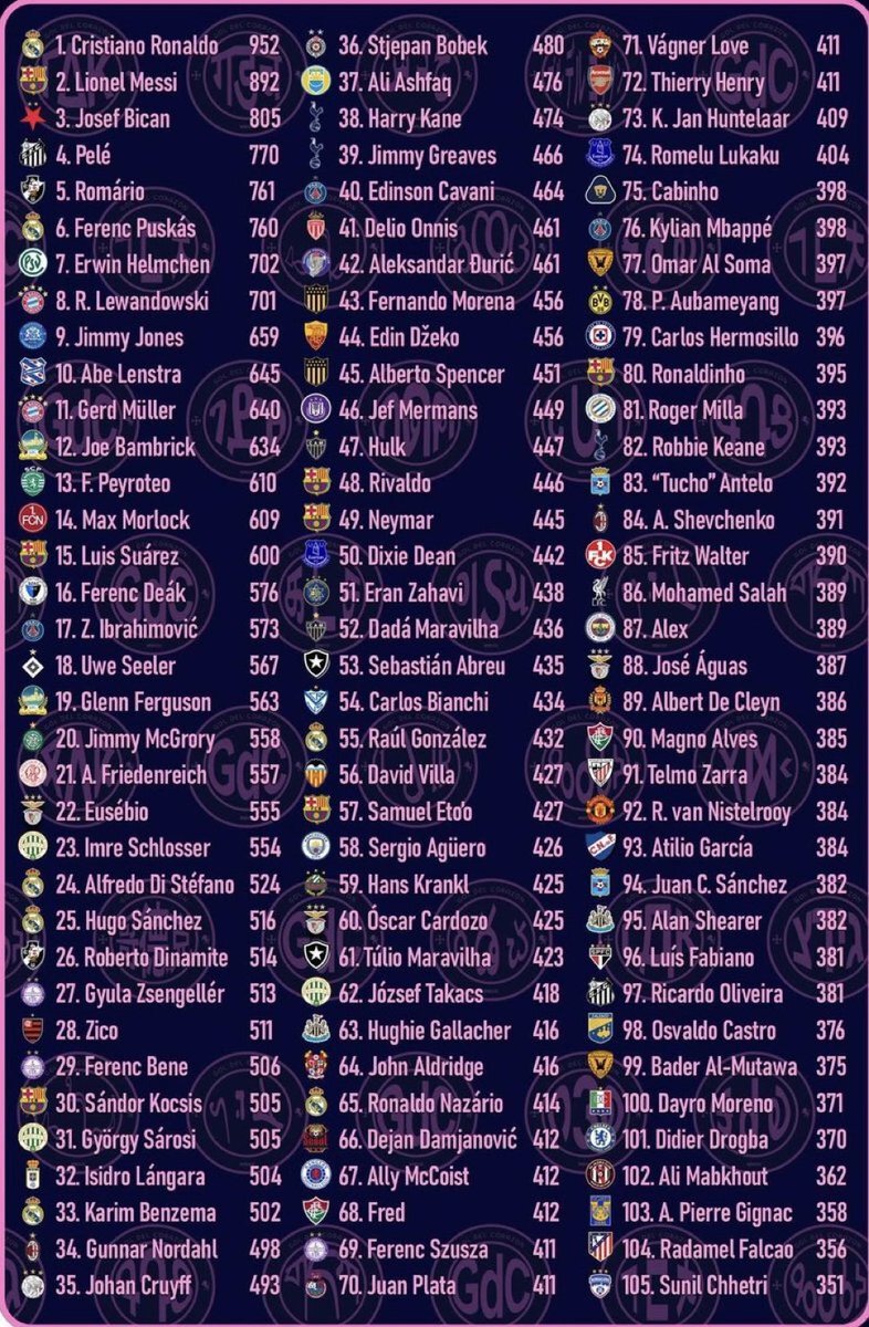 今シーズン上田綺世の活躍で、引き合いに出されるようになったクーン・ディレンは現役通算287ゴールだからランク外なのか。意外。 (当時は公式戦が今より少ないand代表で活躍してないから?) で、90位のMagno Alvesって、あのマグノ・アウベス!? x.com/vannucchi_wccf…