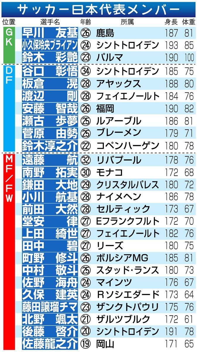 11月日本代表メンバー 小久保玲央ブライアン、北野颯太、後藤啓介が初招集 ■GK 早川友基 小久保玲央ブライアン☆ 鈴木彩艶 ■DF 谷口彰悟 板倉滉 渡辺剛 安藤智哉 瀬古歩夢 菅原由勢 鈴木淳之介 ■MF/FW 遠藤航 南野拓実 鎌田大地 小川航基 前田大然 堂安律 上田綺世 田中碧 町野修斗 中村敬斗