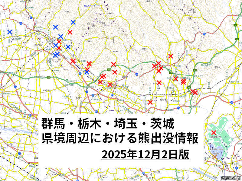 太田市で初目撃、そして子熊の死骸が見つかりました。山を下り、渡良瀬川を越え、国道50号を渡り、八王子丘陵越えです。 群馬・栃木・埼玉・茨城県境周辺の熊出没情報 2025年12月2日版【桐生足利太田】 | 館林くらし tatebayashi.info/kuma-20251202 pic.x.com/Vi3kjSc1nS